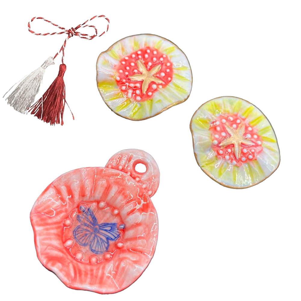 Set cercei și pandantiv – set unicat lucrat manual ,din porțelan ars în cuptor de două ori la 950 grade respectiv 1250; – pictat manual cu aur de 24 karate;  – vin ambalate într-un săculeț elegant negru din catifea, însoțite de un certificat de unicitate. Colecția: Mărțișoare